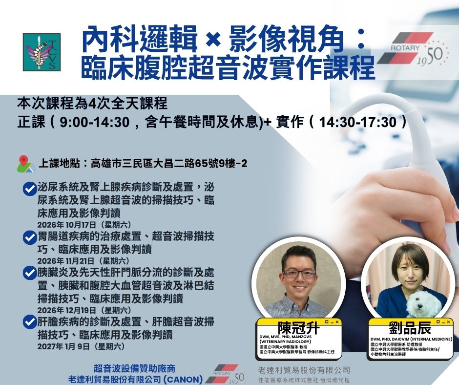 獸醫師在疾病診斷上,除了日常的問診、基本的理學檢查外,許多疾病還需要靠著臨床病理學與影像學的應用,才能給予正確且適當的診斷及醫療處置。本課程的特色不只是幫助臨床獸醫師熟悉超音波機操作、使用時機、限制、掃描位置手勢和超音波下正常及異常影像判讀,更結合了臨床內科學,實驗室診斷及治療處置方法。內容包括臨床獸醫師常會面臨的主題,如消化道、肝膽、胰臟、泌尿系統、腎上腺疾病及超音波導引採樣。透過實作過程,使獸醫師更快速掌握掃描解剖位置。本課程透過豐富病例,臨床數據與影像資料,一同探討實際病例從開始的症狀、血檢的數據,影像的判讀與治療後的結果;並結合超音波實作,幫助第一線臨床獸醫師,能更快速且精準的診斷與治療相關疾病。