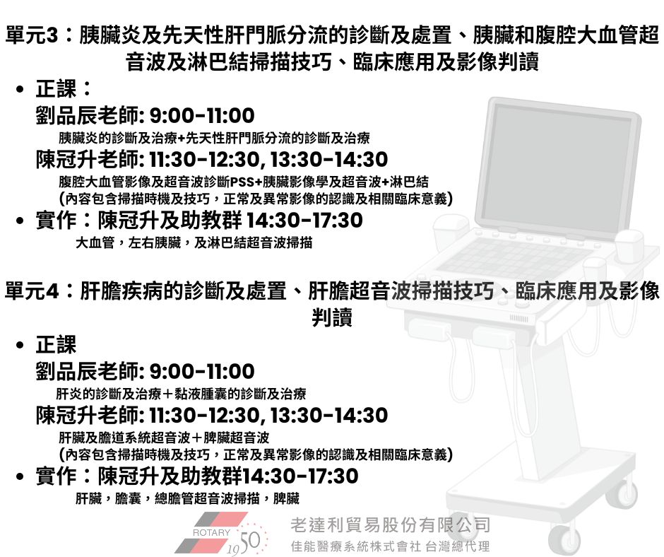 單元3:胰臟炎及先天性肝門脈分流的診斷及處置、胰臟和腹腔大血管超音波及淋巴結掃描技巧、臨床應用及影像判讀